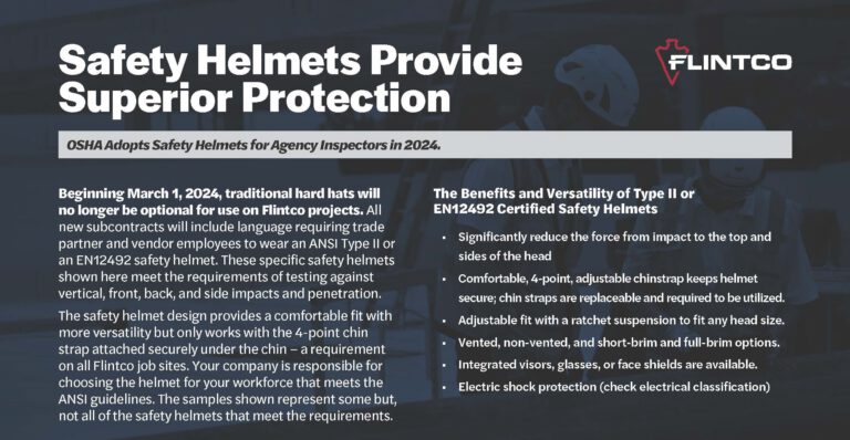 Following 5 years of field use by Flintco and many trade partners; head protection offered by ANSI Type II safety helmets has proven superior over traditional hard hats. Now is the time to take the next clear and evident step in providing superior protection for our industry’s most important asset, our employees. Beginning March 1,…