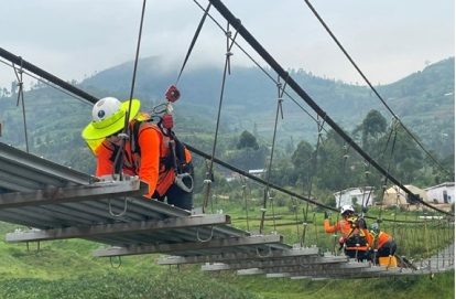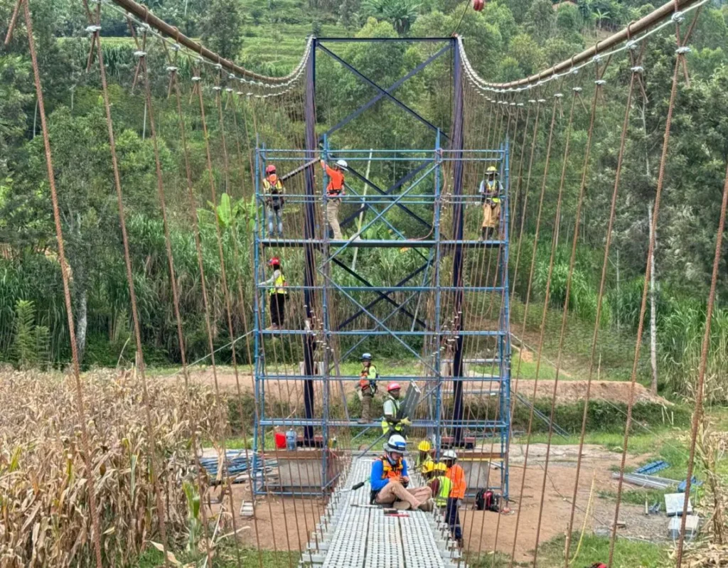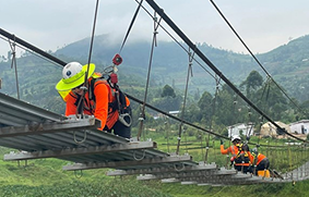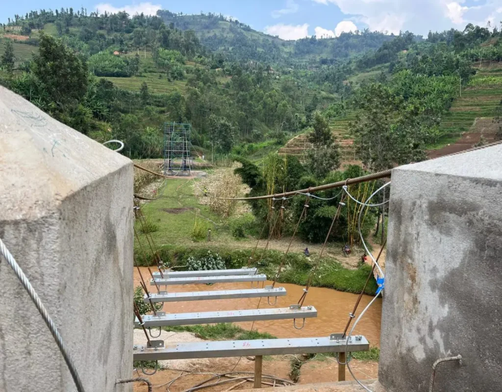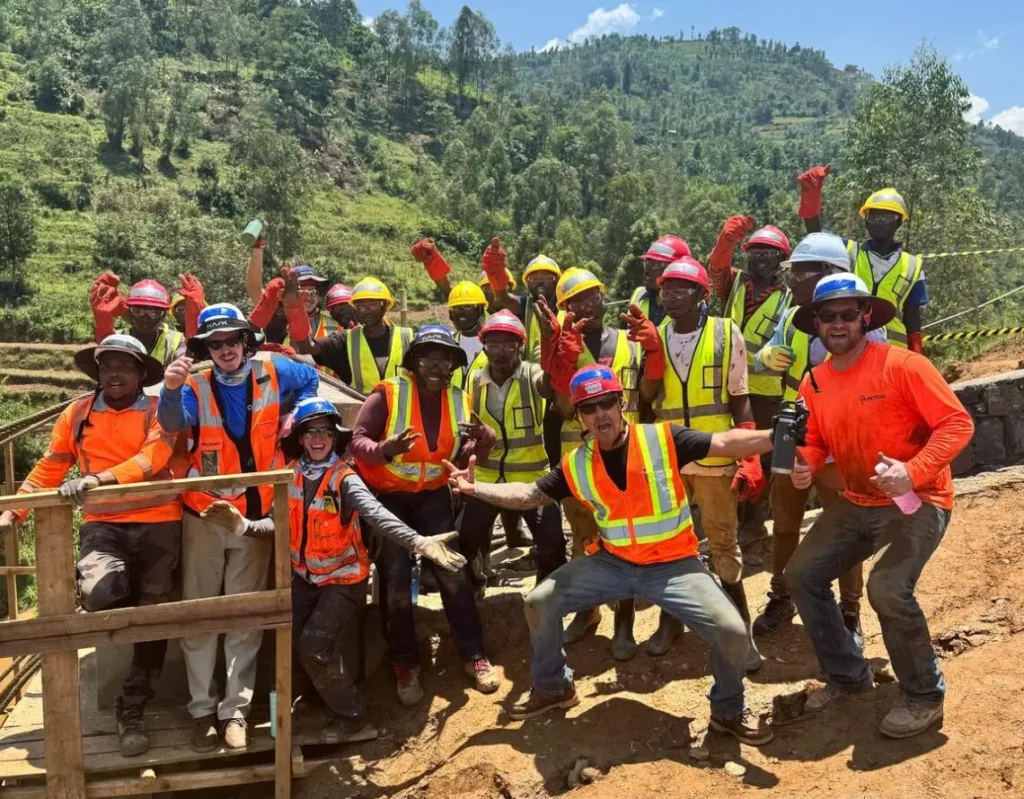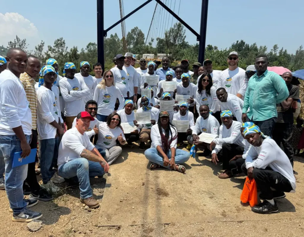 In February 2025, a team from Alberici and Flintco traveled to Rwanda’s Nyamasheke District to build the Bizenga Trail Bridge—a 93-meter hybrid suspension bridge serving nearly 3,000 residents across four communities.