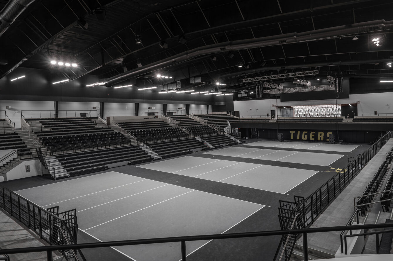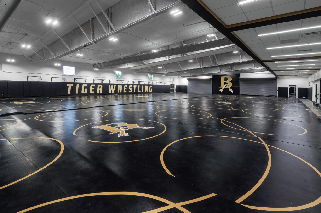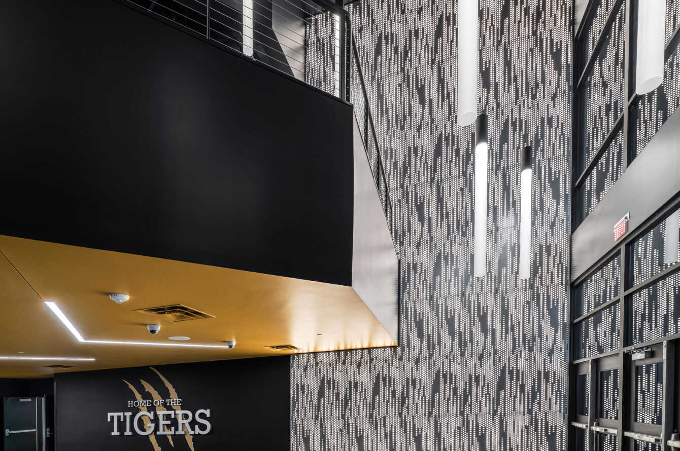 This 114,000 SF two-story facility holds up to 4,500 spectators and sits on a 17.4 acre site. The new event center arena and practice facility addition is home to wrestling, cheer, and volleyball. Features include wrestling practice rooms, three practice volleyball courts with a competition court, a cheer practice room, new weightlifting area, a student plaza, an updated training facility for athlete therapy, and new locker rooms. Theatrical lighting and sound was installed in the main arena for use by the arts for concerts and performances. The event center is also the new home of the BAPS apparel store, Tiger Threads.