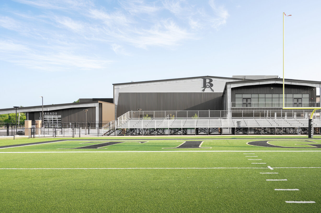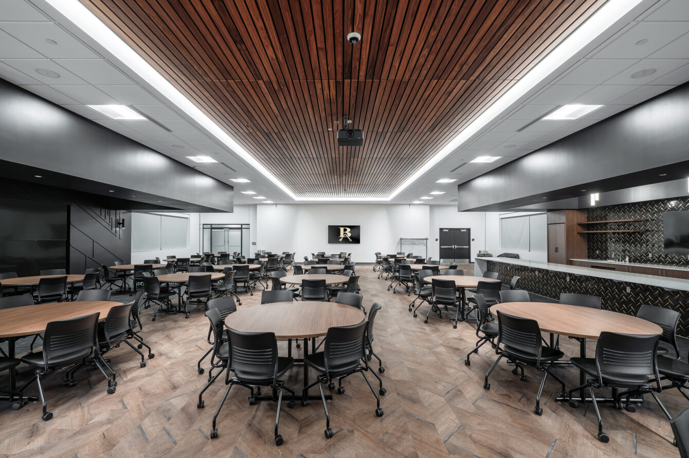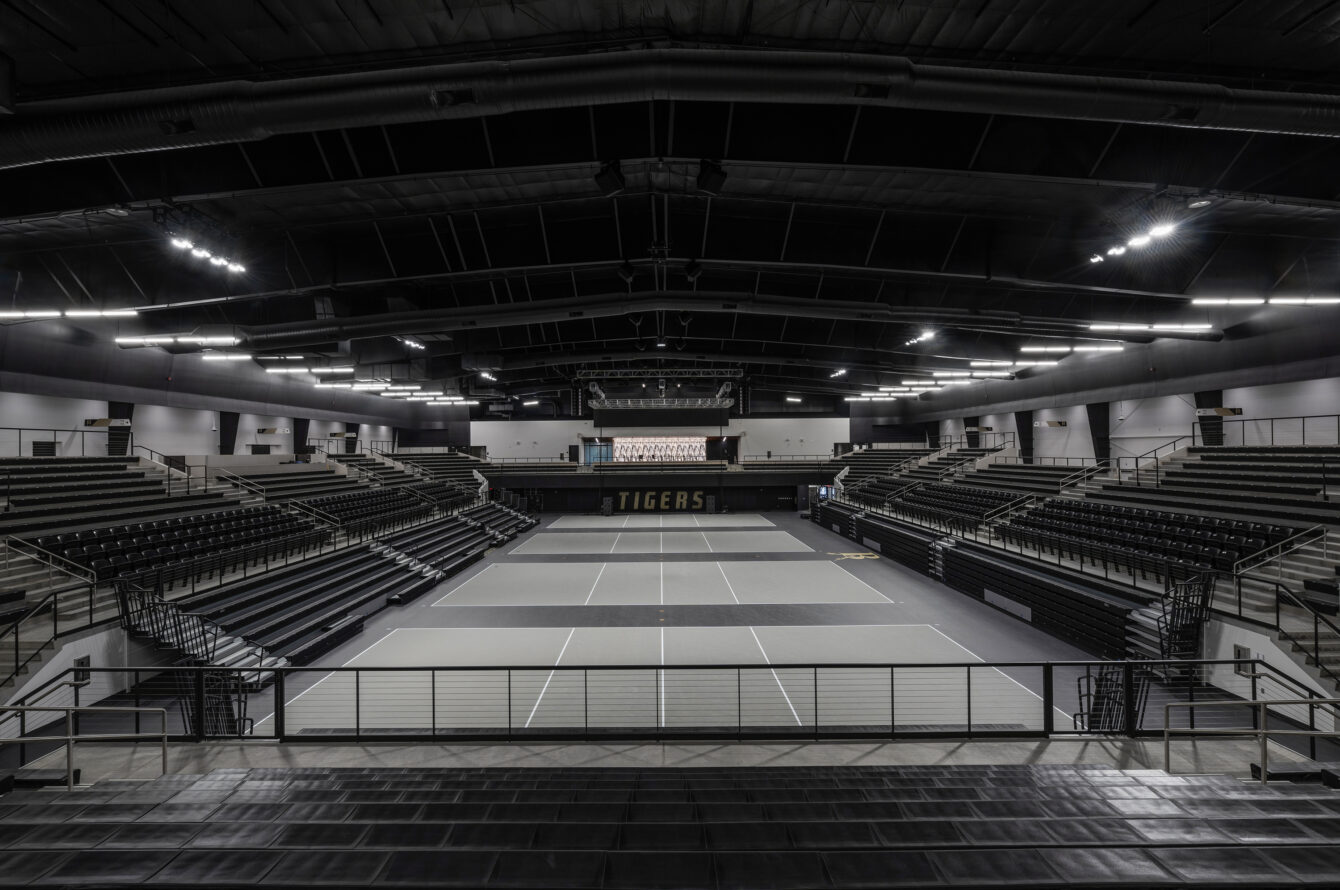This 114,000 SF two-story facility holds up to 4,500 spectators and sits on a 17.4 acre site. The new event center arena and practice facility addition is home to wrestling, cheer, and volleyball. Features include wrestling practice rooms, three practice volleyball courts with a competition court, a cheer practice room, new weightlifting area, a student plaza, an updated training facility for athlete therapy, and new locker rooms. Theatrical lighting and sound was installed in the main arena for use by the arts for concerts and performances. The event center is also the new home of the BAPS apparel store, Tiger Threads.