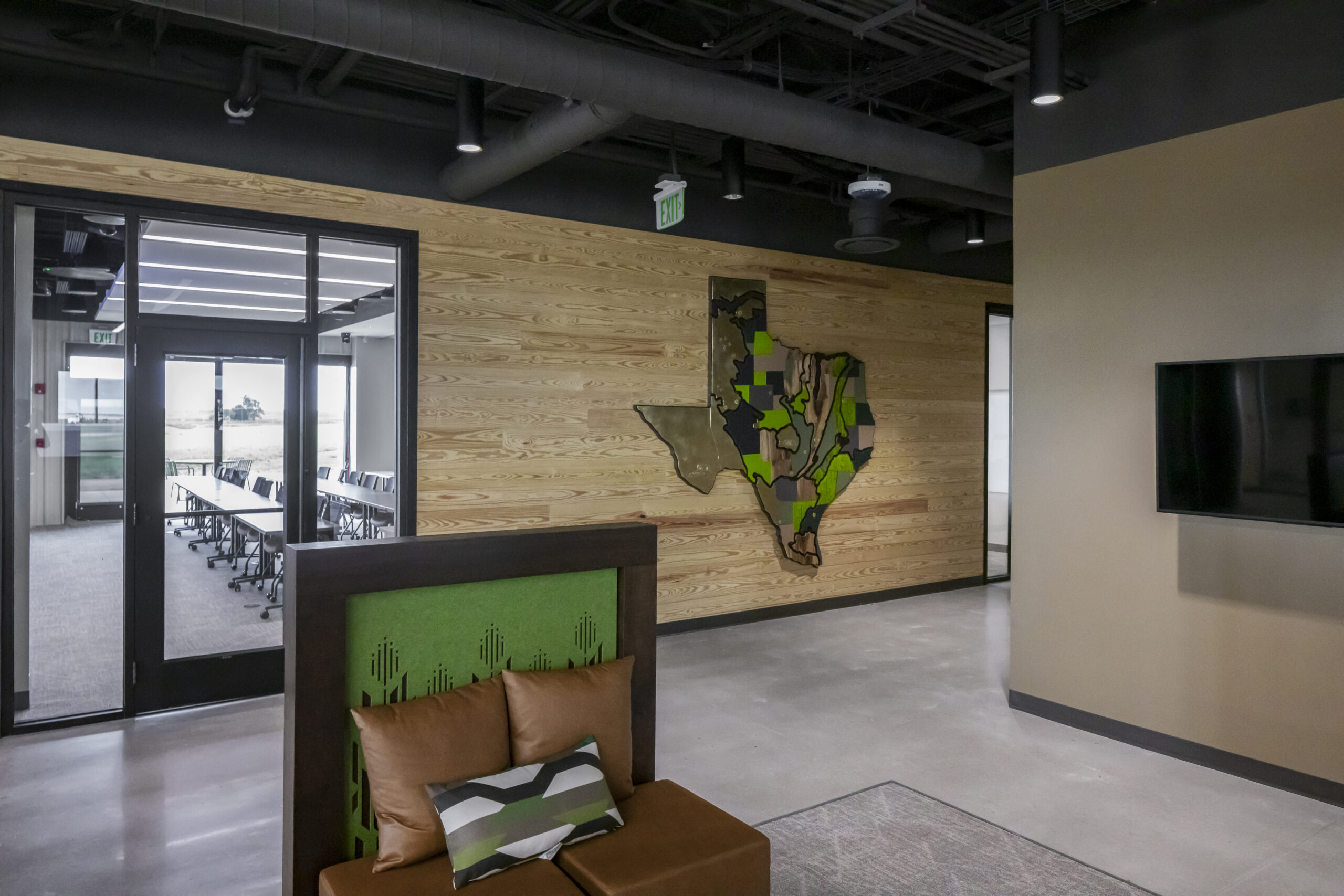 • Modern office lounge with large windows and city view. Features a brown sofa, gray chairs, round black table, and sleek lighting, creating a calming atmosphere.