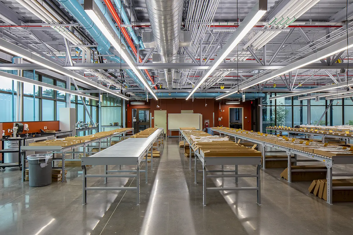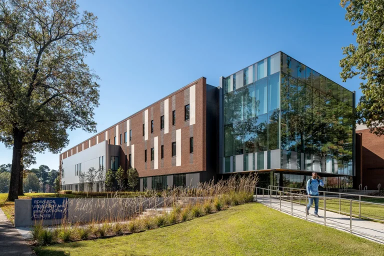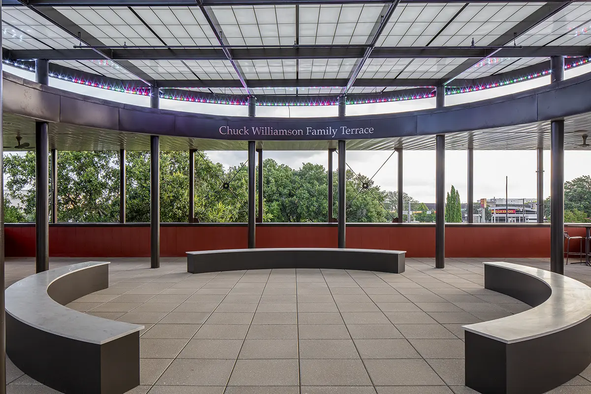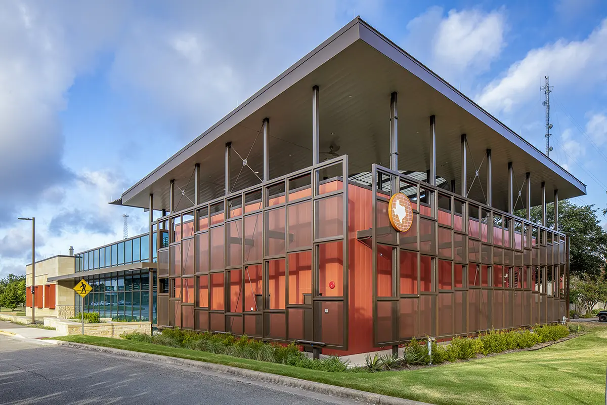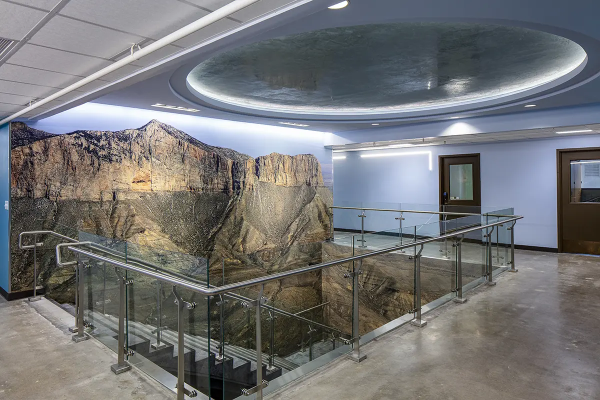Renovations to the Mineral Studies Lab at the University of Texas upgrade laboratories with new fume hoods and eye wash stations, replace doors and windows, and refresh finishes throughout the building. An 18,000-SF addition adds a viewing room and a one-story research building featuring a rooftop terrace with a circular canopy that illuminates at night. A skybridge connects the new addition to the existing lab over the rock garden, creating a functional and visually engaging space.